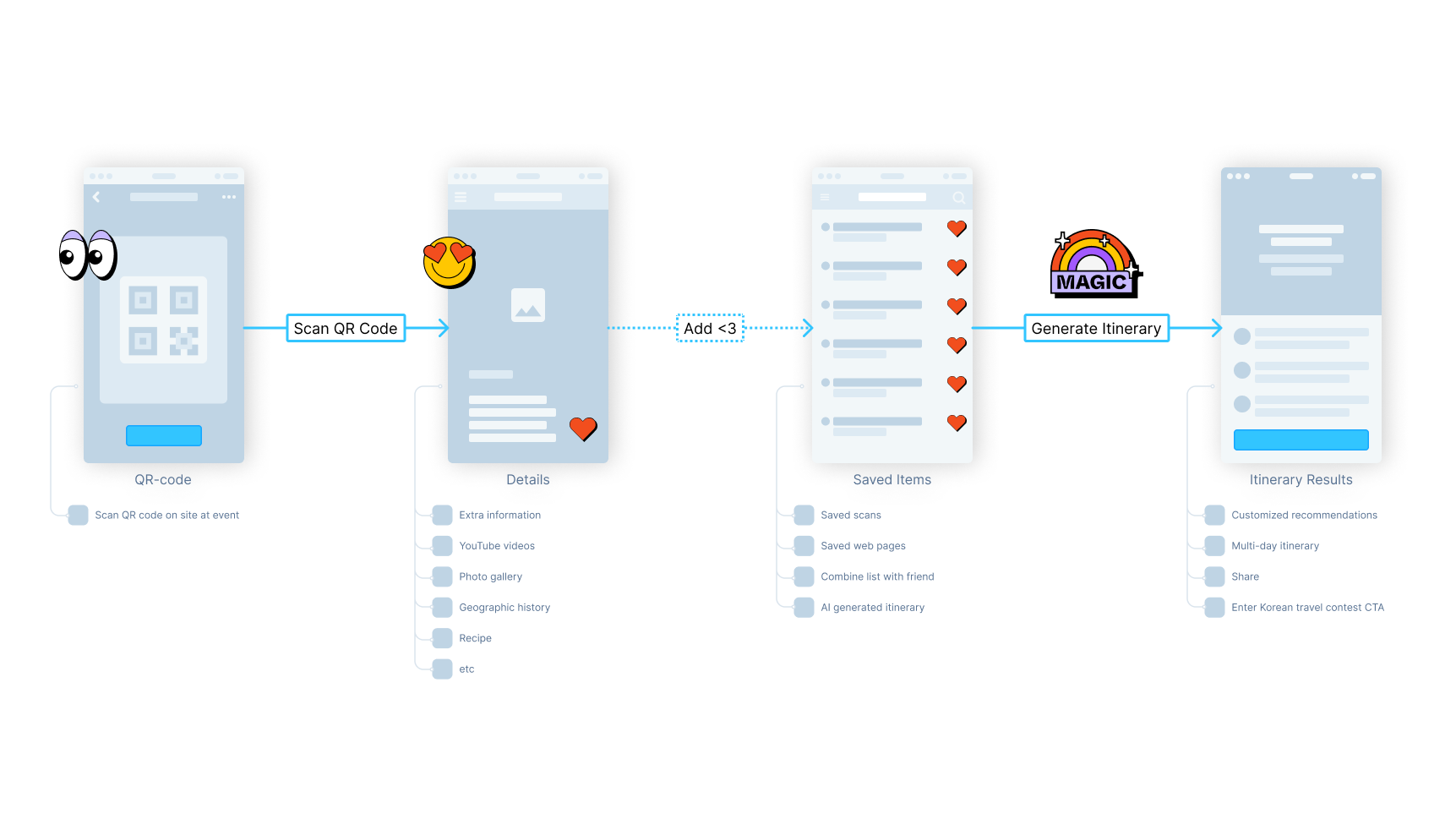 The digital experience was envisioned as more than just an event hub—it needed to transport users into the energy of Korean culture and inspire travel. Early brainstorming explored interactive QR codes that would open micro-experiences for music, food, and artifacts, but logistical constraints led us in a new direction.